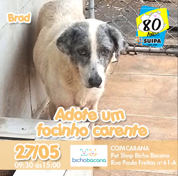 | Dia 27/05 nosso evento "Adote um focinho carente" será na Bicho Bacana SUIPA - 22/5/2023 -SUIPA Brad!!! É um artista mesmo, um galã! Como o Brad a SUIPA tem muitos focinhos que irão transbordar de felicidade quando tiverem uma casa só para eles. Dia 27/05, sábado, nosso evento “Adote um focinho carente” será na #bichobacanaoficial em Copacabana. Participem, venham conhecer os suipanos vocês irão receber muitos lambeijos! :) Estaremos na #bichobacanaoficial com alguns dos suipanos que se encontram para adoção, a lojinha da SUIPA e muita alegria! Dia 27/05 em Copacabana, na Pet Shop Bicho Bacana na Rua Paula Freitas nº 61-A das 9:30 às 15:00hs. Adote um Focinho Carente é um programa permanente realizado pela SUIPA. No nosso site em www.suipa.org.br/adocao você vai encontrar o seu melhor amigo. ADOCÃO NA SEDE: Segunda a Sexta - 8:00 às 13:00 #SUIPA
