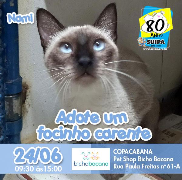 Dia 24/06 em Copacabana, na Pet Shop Bicho Bacana na Rua Paula Freitas nº 61-A das 9:30 às 15:00hs.