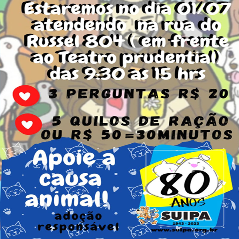 No dia 01 de julho, no nosso evento “Adote um Focinho Carente”, as cartomantes Elaine Coppi e Flávia Castilho irão oferecer consultas a preços populares, cujo valor irá integralmente para a SUIPA.