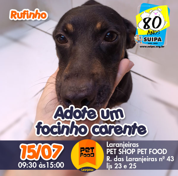 Dia 15/07 em Laranjeiras, na PET SHOP PET FOOD na Rua das Laranjeiras nº 43 ljs 23 e 25 das 9:30 às 15:00hs.