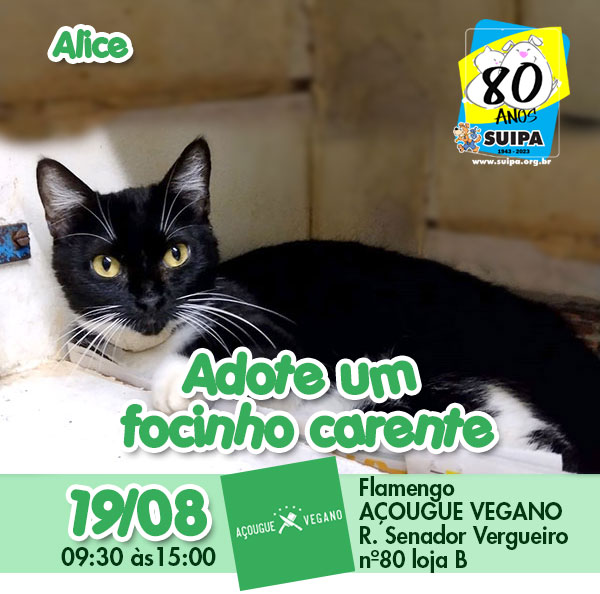 | No dia 19/08 o nosso "Adote um Focinho Carente" estará no Açougue Vegano SUIPA - 14/8/2023 -SUIPA No dia 19/08 o nosso “Adote um Focinho Carente” estará no Açougue Vegano em parceria com o Pet Shop Cães e Gatos seu vizinho. Venham conhecer os suipanos que se encontram para adoção e abraçá-los. É tão bom transmitir amor e receber gratidão. Quem puder levar a sua doação de insumos para o abrigo agradecemos de imensamente: