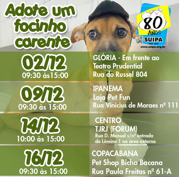 Vamos aos nossos eventos "Adote um Focinho Carente" em Dezembro. Venham abraçar os suipanos, trazer seu presente de natal e ou comprar sua lembrancinha na lojinha da SUIPA.