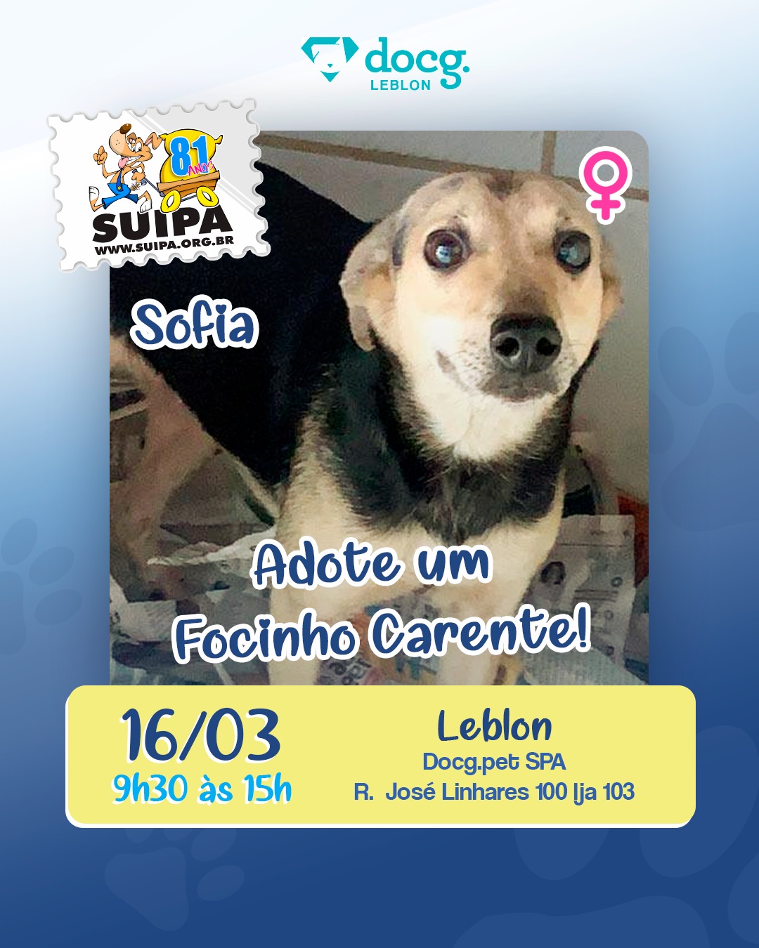 Nosso evento #AdoteUmFocinhoCarente da semana será no Leblon! A Sofia e outros suipanos estarão à procura de um lar amoroso na @docg.leblon ✨