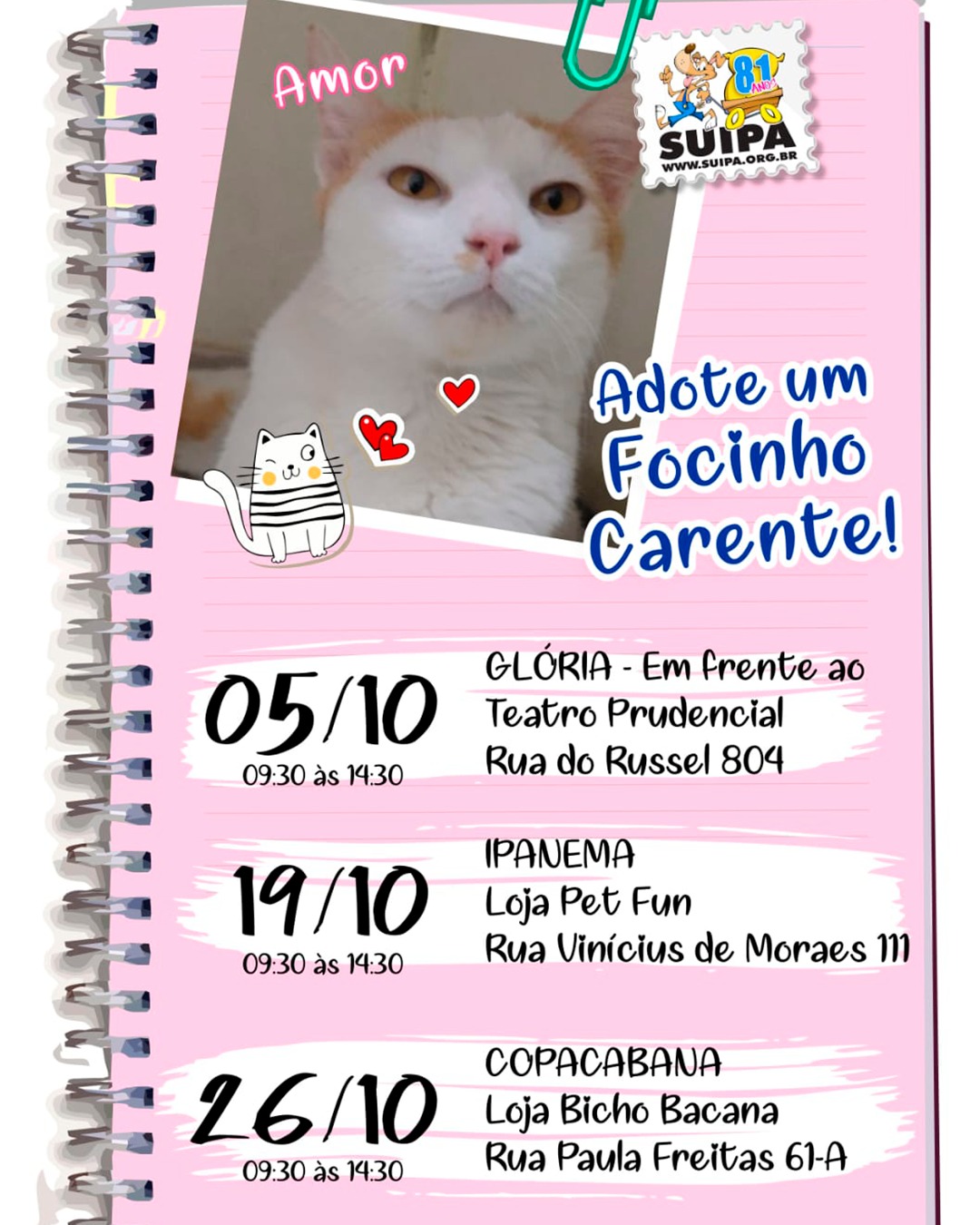 👉 Além dos eventos, você também pode adotar diretamente em nossa sede em Benfica. Compartilhe para que nossos anjinhos tenham mais chances de encontrar uma família!