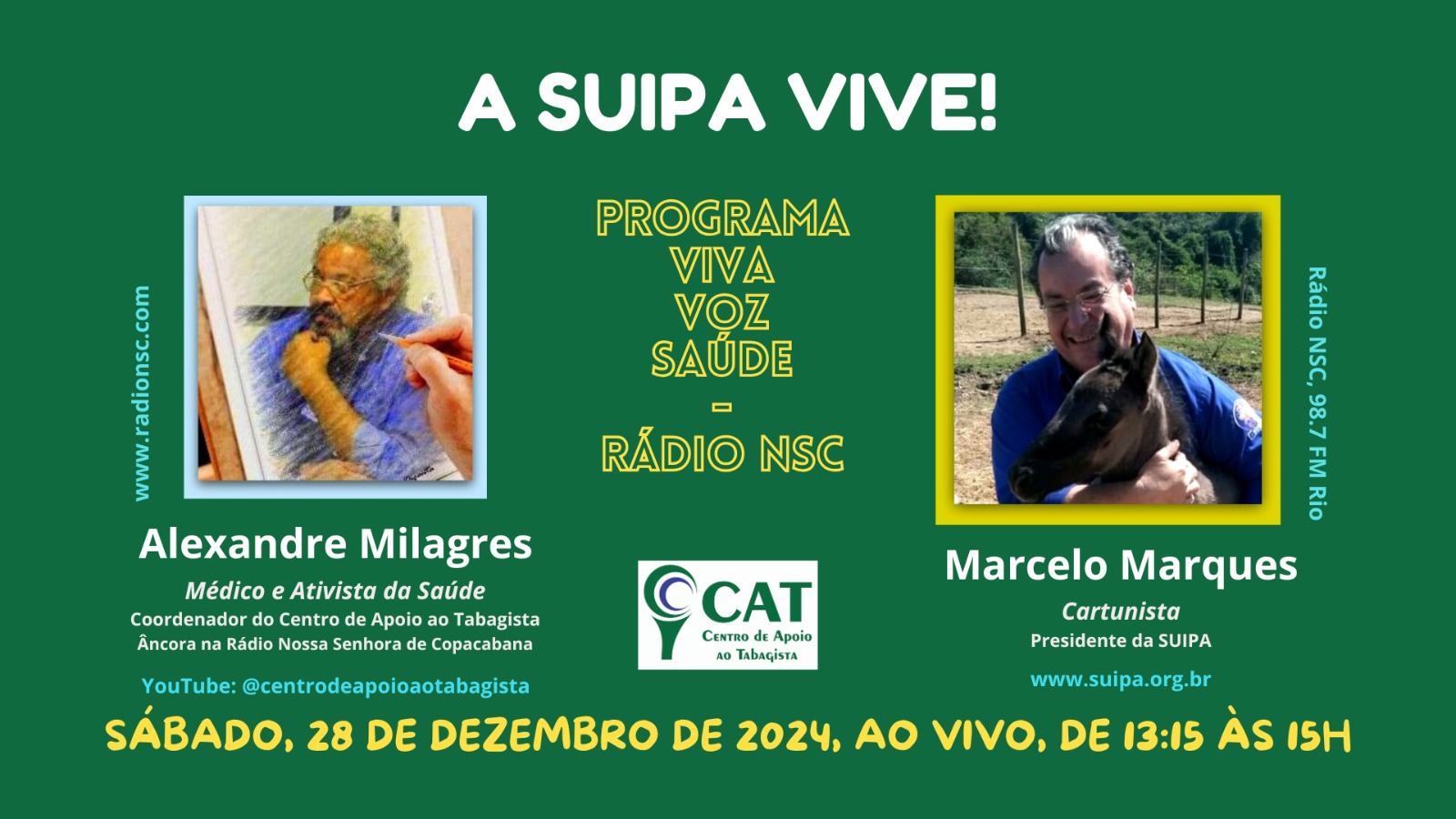 Amanhã sábado dia 28/12/24 às 13h:15 a Suipa na figura de seu diretor presidente Marcelo Marques , estará no programa Viva Voz Saúde na Rádio Nossa Senhora De Copacabana batendo uma papo com Alexandre Milagres.Vamos falar da história da Suipa, seu cotidiano e desafios nesses 82 anos de existência lutando pelos animais! Esperamos vocês!