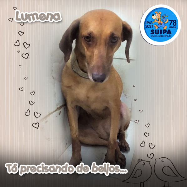A Lumena tem em torno de cinco anos, é uma menina muito tranquila e aguarda a sua chance de ser adotada e ser o xodó de uma linda família.