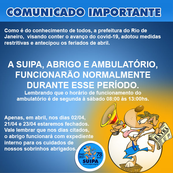 A SUIPA, ABRIGO E AMBULATÓRIO, FUNCIONARÃO NORMALMENTE DURANTE ESSE PERÍODO. Lembrando que o horário de funcionamento do ambulatório é de segunda à sábado 08:00 às 13:00hs.