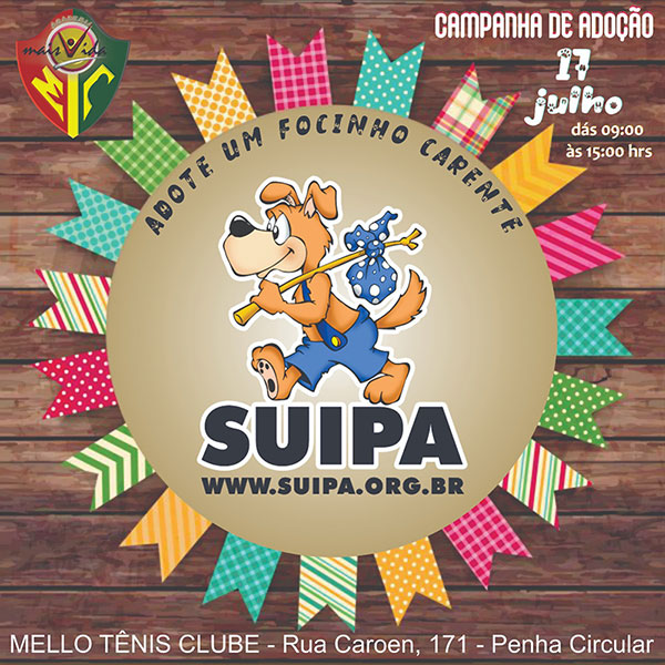 | Todos merecem uma nova chance - Dia 17 de julho SUIPA - 6/7/2021 -SUIPA Na programação para julho, no dia 17, marcaremos presença na festa Julina que será promovida pelo Mello Tênis Club localizado na Rua Caroen nº 171 – Penha. Os suipanos estarão presentes no evento com a esperança de serem adotados por famílias que amam os animais. Todos merecem uma nova chance. Por favor, não esqueçam de nós! NÃO COMPRE, ADOTE! ADOTAR É UM GESTO DE AMOR! |