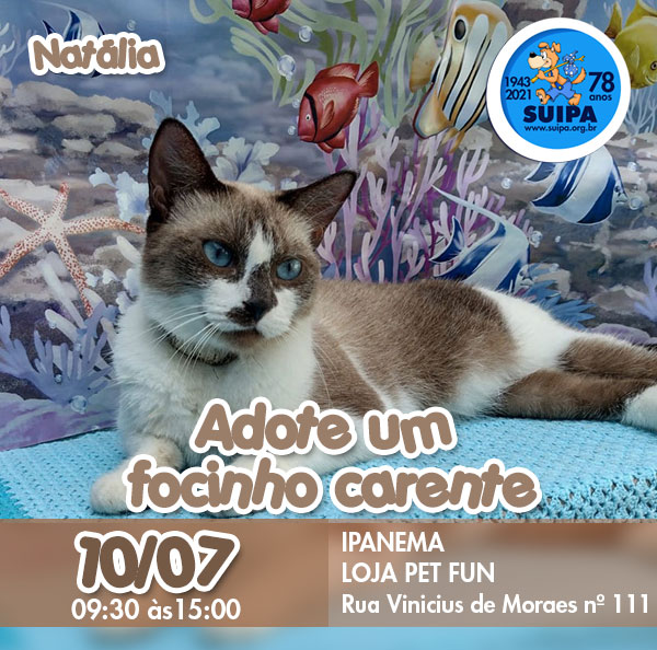 | Adote um Focinho Carente - sábado dia 10/07 na PET FUN em Ipanema SUIPA - 8/7/2021 -SUIPA O próximo “Adote um Focinho Carente” será neste sábado dia 10/07 em Ipanema, na Loja PET FUN na Rua Vinícius de Moraes nº 111 das 9:30 às 15:00hs. Nossos eventos estão voltando aos poucos. Semana a semana, vamos divulgar e confirmar os locais onde estaremos presentes com os suipanos para adoção, a lojinha da SUIPA e o Bazarcão. Quem puder ajudar de alguma forma, segue abaixo uma lista com alguns medicamentos que são bastante utilizados no abrigo e que estamos precisando: www.suipa.org.br/comoajudar |
