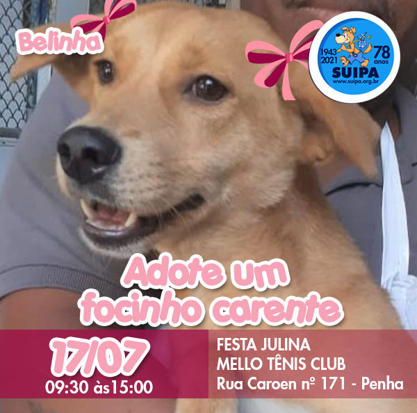Nosso próximo “Adote um Focinho Carente” será neste sábado dia 17/07 na Penha, na Festa Julina do Mello Tênis Clube na Rua Caroen nº 171 das 9:30 às 15:00hs.
