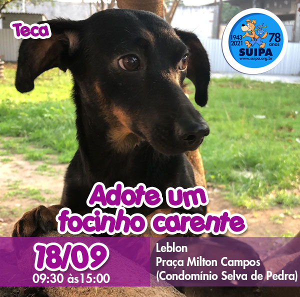 | Adote um focinho carente - Dia 18/09 no Leblon na Praça Milton Campos(Condomínio Selva de Pedra) SUIPA - 16/9/2021 -SUIPA A Teca é uma fofura que chegou aqui na SUIPA pequenininha. Hoje já está mais crescida e guarda o mesmo olhar de filhote. Às vezes, a gente pensa: como pode um serzinho desses ser abandonado? A Teca, como muitos outros, merece a chance de ter uma casa, uma família só para ela. Ela vai caber direitinho no colo de quem a escolher. A Teca, o Marlon, a Jujuba, o Budogy, os gatinhos José, a Joy, o Happy e o Amor estarão no nosso próximo “Adote um focinho carente” neste sábado dia 18/09 no Leblon na Praça Milton Campos (Condomínio Selva de Pedra) das 9:30 às 15:00hs. Vocês também podem conhecê-los através do nosso site em www.suipa.org.br/adocao. Compareçam, participem! Vamos estar com os suipanos para adoção, a lojinha da SUIPA e o Bazarcão. Quem quiser pode também levar suas doações de jornais, tampinhas, potinhos e ração neste dia, será de grande ajuda!