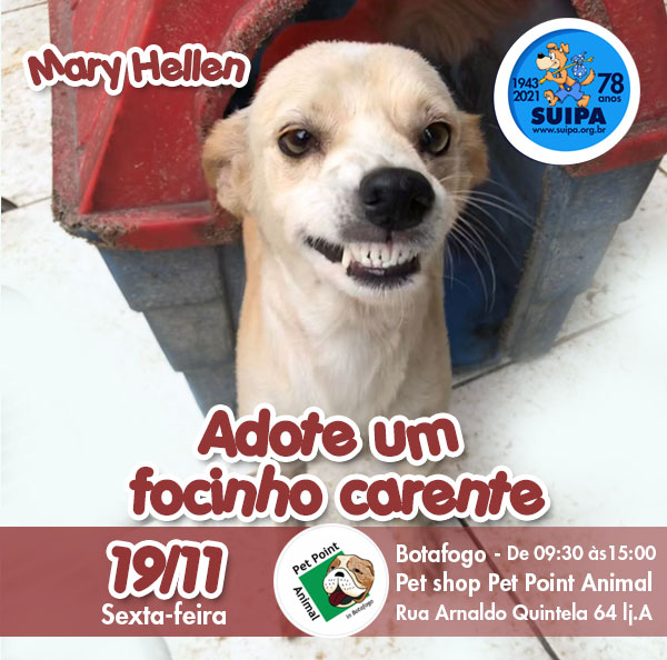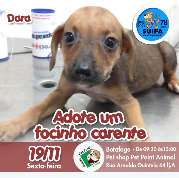 | 19/11 - Adote um focinho Carente na Pet Point Animal em Botafogo. SUIPA - 15/11/2021 -SUIPA Se você ainda não teve a oportunidade de ir a um de nossos eventos de Adoção não perca, nesta sexta-feira dia 19/11, o “Adote um Focinho Carente” que vai acontecer no Pet Point Animal em Botafogo. A Dara, a Serelepe, a Kira e os nossos maravilhosos felinos estarão presentes aguardando a chance de serem adotados! Vocês podem nos visitar e com certeza irão levar um pouco do amor imenso que os suipanos tem para dar. Quem puder fazer também a sua doação de ração e comidinha úmida para suipanos será de grande ajuda. Estamos precisando muito! Vocês também podem conhecer alguns dos suipanos que se encontram para adoção através do nosso site em www.suipa.org.br/adocao. “Adote um focinho carente” na sexta-feira no dia 19/11 na #petpointanimal em Boatafogo, na Rua Arnaldo Quintela 64 A #SUIPA
