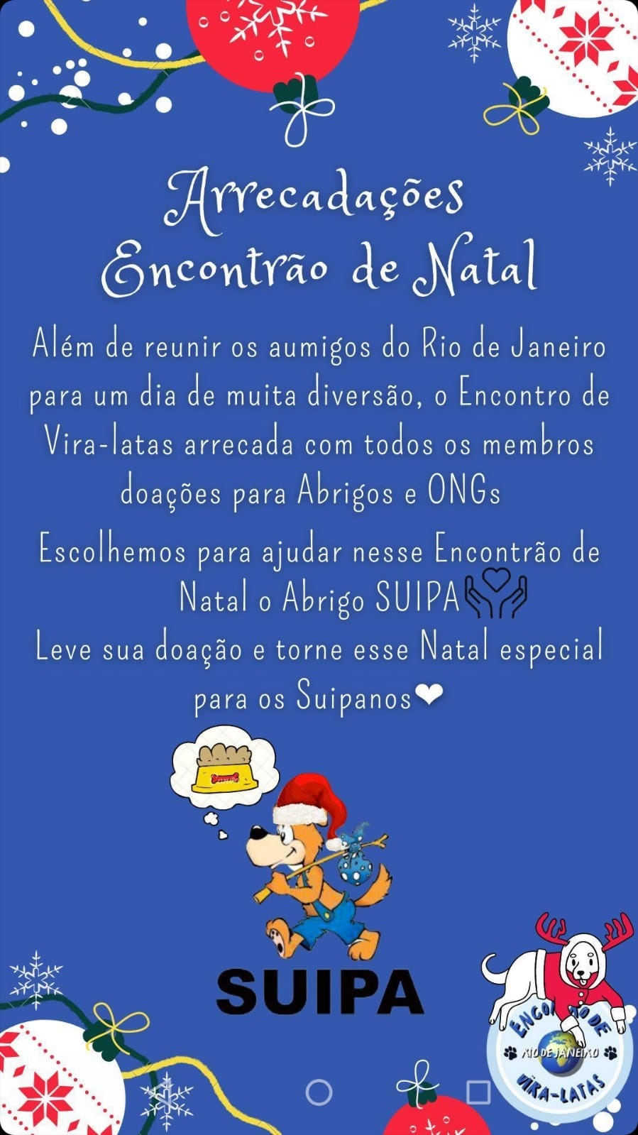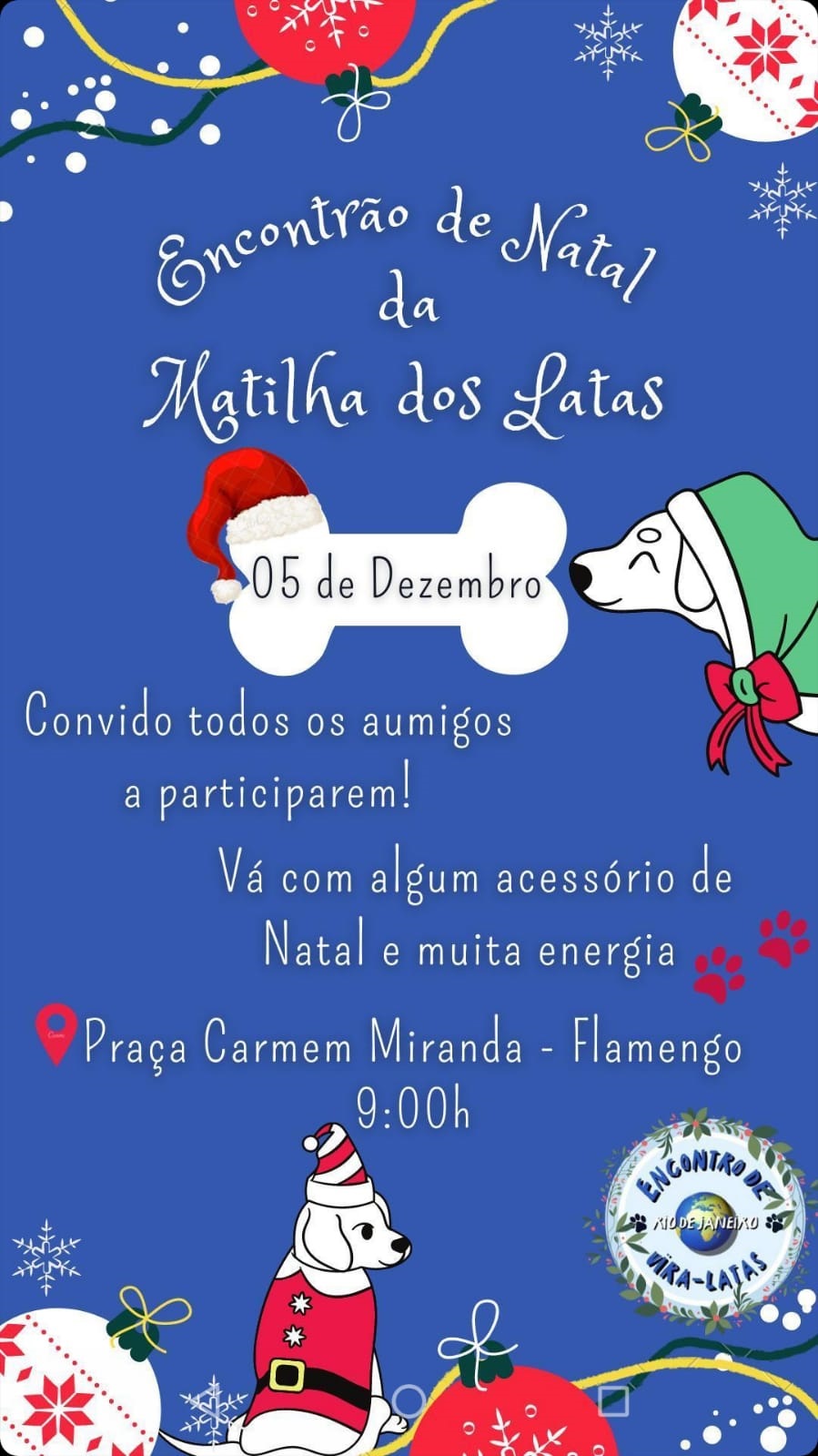 Dia 05 de dezembro, o Encontrão de Natal das Matilhas dos Latas estará promovendo um evento na Praça Carmem Miranda no Flamengo às 9:00hs para reunir os Amigos e recolher doações de ração para a SUIPA. A ação foi criada pelo “Encontro de vira-latas do RJ”. Participem! Levem seus pets e aproveitem a oportunidade para rever os Aumigos! Estaremos lá com nossa mascote Rose para conhecer esses peludos!