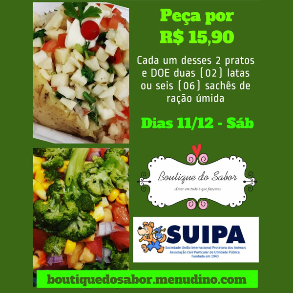 A @rjboutiquedosabor criou uma ação para ajudar os suipanos. Doando duas (2) latas ou seis (6) sachês de ração úmida e tenha uma refeição vegana por R$ 15,90 e isenta da taxa de entrega.