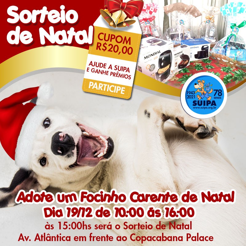 No dia 19/12, venham ABRAÇAR OS SUIPANOS, ADOTAR um AMIGO que será sua COMPANHIA para muitos Natais, PARTICIPAR do SORTEIO ou COMPRAR sua lembrancinha de Natal NA LOJINHA DA SUIPA.