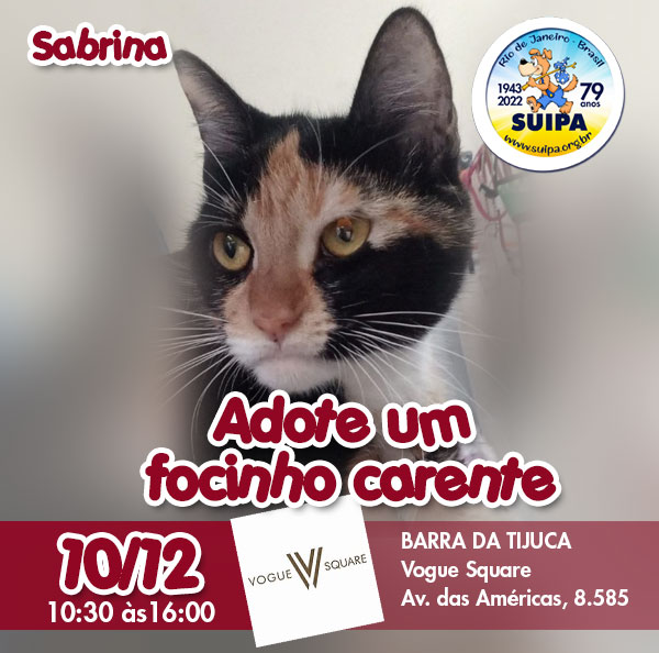 | Pessoal, mais uma data de Adote um Focinho Carente confirmada. Obaaa!!!😊 SUIPA - 2/12/2022 -SUIPA Pessoal, mais uma data de Adote um Focinho Carente confirmada. Obaaa!!!😊 Nosso “Adote um Focinho Carente” no dia 10/12 estará também no Vogue Square na Barra da Tijuca, na Av. das Américas 8.585 das 10:30 às 16:00hs. Estaremos presentes com os suipanos para adoção e a lojinha da SUIPA. Participem, os suipanos adoram ser abraçados, beijados e quem sabe a esperança se torna realidade e eles encontram a sua nova família. Eles merecem! Aproveitem para comprar as lembrancinhas de Natal na Lojinha da SUIPA. Já estamos com o calendário de 2023 e muitas outras novidades. Venham nos visitar! Vocês também podem conhecê-los através do nosso site em www.suipa.org.br/adocao. #SUIPA |