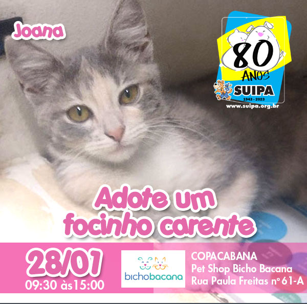 Dia 28/01 em Copacabana, na Pet Shop Bicho Bacana na Rua Paula Freitas nº 61-A das 9:30 às 15:00hs.