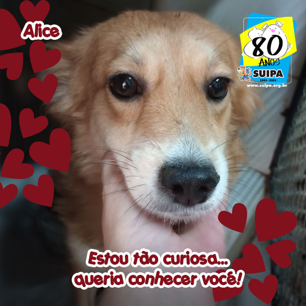 Alice tem aproximadamente dois anos de idade e um focinho muito gostoso de beijar. Estamos torcendo para que tenha a sua chance de fazer um humano feliz.