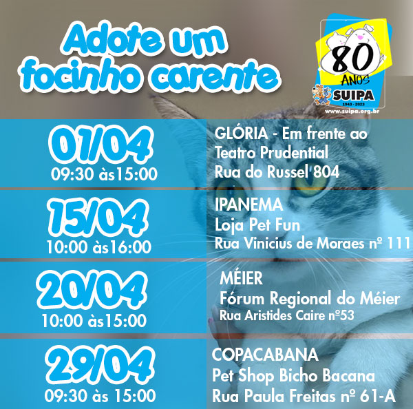 | Confiram as datas do nosso "Adote um focinho carente" de Abril SUIPA - 8/4/2023 -SUIPA No dia 27 de Abril a SUIPA completa 80 ANOS DE EXISTÊNCIA. A LUTA CONTINUA, mesmo com todas as dificuldades, porque acreditamos que um mundo melhor e mais justo ainda é possível. PRECISAMOS MUITO DE VOCÊS para mantermos este trabalho VIVO. Vamos comemorar juntos esta grande jornada! Confiram as datas do nosso “Adote um focinho carente” de Abril: Dia 01/04 na Glória em frente à antiga sede da TV manchete - 9:30 às 15:00hs Dia 15/04 na Loja Pet Fun em Ipanema na rua Vinicius de Moraes nº 111 - 9:30 às 15:00hs Dia 20/04 no Méier no Fórum Regional do Meier na Rua Aristides Caire nº53 - 10:00 às 15:00hs Dia 29/04 em Copacabana na pet Shop Bicho Bacana, na Rua Paula Freitas nº 61 A em Copacabana - 9:30 às 15:00hs Venham nos visitar! www.suipa.org.br/comoajudar