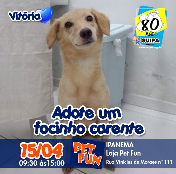 O próximo “Adote um Focinho Carente” será neste sábado dia 15/04 em Ipanema, na Loja PET FUN na Rua Vinícius de Moraes nº 111 das 9:30 às 15:00hs.