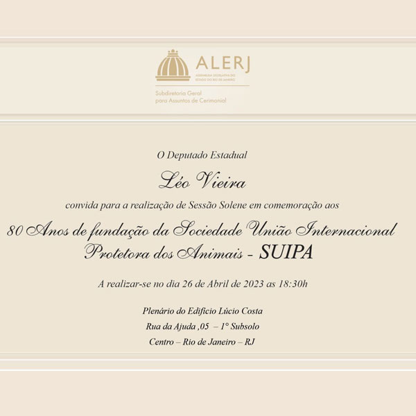 Recebemos o convite do Deputado Léo Vieira que realizará uma sessão Solene na ALERJ em homenagem ao trabalho que a SUIPA desenvolve há 80 anos!!!